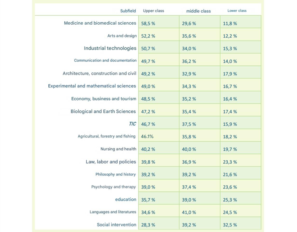 On the other hand, in Education, 36% of graduates come from the upper class and 25% from the lower class. In Languages and Literature, the figures are 35% and 25% respectively, while in Social Work there would be a more balanced ratio.